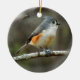 This Christmas ornament features an original photo of a tiny Tufted Titmouse on the branch of a Peach Tree.