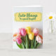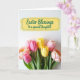 This design shows a tall bouquet filling the lower half of the card, with pink and yellow tulips rising among softer peach and blush flowers whose frilled petals open to small yellow centers 🌷. Deep green stems and leaves gather tightly at the base, creating a lush foundation against a bright off‑white background. Above the flowers sits a long, horizontal label in butter‑yellow with a lightly brushed edge, outlined in emerald green. Centered inside that label, the message “Easter Blessings to a special Daughter” appears in deep green lettering, standing out clearly against the warm yellow. The gentle, diffused light gives the petals a velvety look and lets the greens appear crisp, like a fresh spring morning. The close clustering of blooms and the soft color pairing suggest a tender bond, like a caring note shared between family or close friends 🐰. Subtle shadows fall behind the bouquet, and the yellow label floats neatly above it with its green border sharply defined.