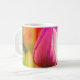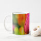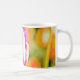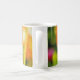 A purple tulip stands in front of a collage of orange, green and yellow.