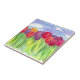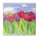 A pretty ceramic tile featuring a field of bright coloured tulip flowers painted in shades of red, yellow, purple, and mauve watercolor under a periwinkle blue sky.