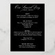 This is a 5' x 7" wedding invitation, shown in elegant black with rose gold foil accents. The front of the invitation has a wide foil border with rounded bottom corners. This is genuine Italian foil, available in gold, silver, and rose gold. The foil accents include the bride and groom's name, a whimsical heart and horizontal line, a tulip flower design, and a foil outline on the front. The reverse includes an 'Our Special day' motif, with details about the wedding.