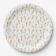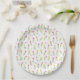Tulips and butterflies white pattern paper plates.  Design features pink, yellow and orange tulips on a white background.  Pink and yellow butterflies frolic around the tulips, enhancing the joyful aesthetic with a whimsical touch!