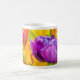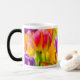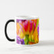 Colourful violet, purple, pink tulips on a flowerbed. Virtually all the rainbow colours present. Bright and positive floral scene. Macro photography. Coffee mug for anyone.