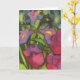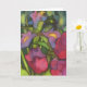 A greetings card with bright pink tulips with purple and blue irises against a dark leafy background.