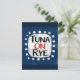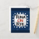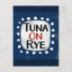 A fun and cute typographic message design that says "Tuna On Rye". It has black and red text on a white rectangle with funky, playful white dots surrounding it, all on a blue background.