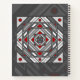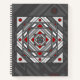 A concentric square mandala takes on the appearance of a tunnel that draws the viewer in with a combination of angled lines, triangles, and circles in shades of grey, red, and white to almost create an optical illusion.