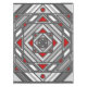 A concentric square mandala takes on the appearance of a tunnel that draws the viewer in with a combination of angled lines, triangles, and circles in shades of grey, red, and white to almost create an optical illusion.