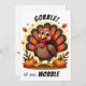 A funny Thanksgiving card featuring a quirky turkey with the playful phrase ‘Gobble til you Wobble’—perfect for sharing laughs and holiday cheer with family and friends.