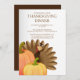 Modern rounded corner die cut turkey with pumpkins Fall Thanksgiving Invitation featuring a cute turkey with orange pumpkins set on a white background. Flip our contemporary thanksgiving invite for a coordinating brown back. Beautiful & unique invitation for your Thanksgiving day celebration.