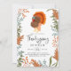 Rustic Thanksgiving dinner party invitation card featuring an illustration of a turkey with fall foliage.