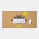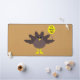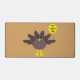 This awesome desk mat features a funny cartoon of a turkey with big black eyes, a small yellow beak and tail feathers sticking up. The feet are facing in opposite directions making the turkey look clumsy. The turkey is holding a yellow balloon with a message inside that says “it’s turkey time”. This is a fun thanksgiving party design.