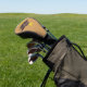 This awesome golf driver cover features a funny cartoon of a turkey with big black eyes, a small yellow beak and tail feathers sticking up. The feet are facing in opposite directions making the turkey look clumsy. The turkey is holding a yellow balloon with a message inside that says “it’s turkey time”. This is a fun thanksgiving party design.