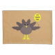 This awesome pillowcase features a funny cartoon of a turkey with big black eyes, a small yellow beak and tail feathers sticking up. The feet are facing in opposite directions making the turkey look clumsy. The turkey is holding a yellow balloon with a message inside that says “it’s turkey time”. This is a fun thanksgiving party design.