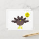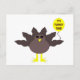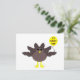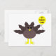 This funny Thanksgiving postcard features a funny cartoon of a turkey with big black eyes, a small yellow beak and tail feathers sticking up. The feet are facing in opposite directions making the turkey look clumsy. The turkey is holding a yellow balloon with a message inside that says “it’s turkey time”. This is a fun thanksgiving party design.