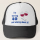 "I'm turning 40 and wining about it" is the verbage on this hat. The graphic is two glasses of red wine. This hat can be customised to have a person's name and the age can be changed to fit your need.