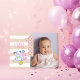 Celebrating turning one with pink polka dot, numeral one, and cute, stuffed purple dog and pink and white, stuffed cat. Photo template on front made for you with beige and white stripes. Reverse side with party templated details.