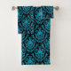 Turquoise and Black Damask Print Towel Set Towel Set. Turquoise blue green vintage style damask pattern on black towels.
