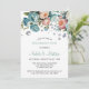 A stunning watercolor floral arrangement featuring turquoise, dark mint, peach, and dark peach peonies and roses, beautifully accented with diamond elements and deep green foliage. Perfect for elegant wedding invitations!