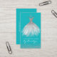 Elegant dress seamstress business card, with graphics of a white and silver glitter dress, against a turquoise background, with silver glitter looking accents. Personalise the text to suit your business needs. A lovely stand out card for your tailoring business.