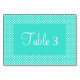 Turquoise and tiny white polka dot pattern with table number. You can customise the background and font colour, as well as the font style and size.