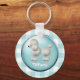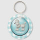 Cute poodle key chain done in a turquoise and white gingham pattern. Graphics of a large turquoise button, in the middle, has adorable graphics of a fluffy white poodle, and white custom text. Personalise the text to read what ever you want. Makes a great gift idea.