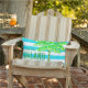 This classic tropical shades of turquoise blue and white wide stripe pillow is a summer staple. Add a colourful palm tree and Aloha and it becomes a tropical vision! You can change the text to whatever you want. A stunning addition to your outdoor living area. Perfect for the pool, beach, garden, ot anywhere you need a tropical vibe. These pillows are also available in indoor fabrics as well as outdoor fabrics, 3 styles/sizes to choose from.