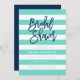 Stylish Bridal Shower invitation featuring the words "Bridal Shower" in trendy blue brush script against a turquoise and white stripes background. Card has a matching blue back side. Check out other matching items here https://www.zazzle.com/collections/119250194970828530?rf=238364477188679314