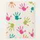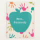 A planner for teachers featuring an illustration of a turquoise apple over a multicolor handprint background. Back side also has hand print pattern. Personalise the name.