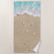 Beautiful turquoise beach waves rolling up on soft beach sand covered in pretty seashells decorate this beach towel.