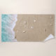 Beautiful turquoise beach waves rolling up on soft beach sand covered in pretty seashells decorate this beach towel.