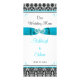 This romantic black and white damask wedding menu card has an image of a pair of joined hearts overtop a turquoise or teal blue ribbon and bow image running across the width of the card. There are turquoise flourishes on all four corners on the front and back text areas. Below the ribbon on a white background the names of the bride and groom, and the wedding date are printed in turquoise and black, with "Our Wedding Menu" in black sdript above the ribbon. The back is black and white damask pattern with a solid black text area that contains the menu details in white with accents of turquoise in the top and bottom border, along with the four corner flourshes. If you need any additional matching items, please email your request to niteowlstudio@gmail.com or use the Zazzle chat feature to get in touch.