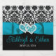 This romantic black and white damask pattern sparkling wine bottle labels have a turquoise blue joined hearts image over a teal or turquoise blue ribbon and bow image running across the centre of the label with the names of the bride and groom below the ribbon on a black background. The wedding date is printed in white below the names. If you need any additional matching items, please email your request to niteowlstudio@gmail.com or use the Zazzle chat feature to get in touch.