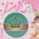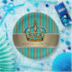 Turquoise blue and gold prince crown with pretty turquoise and gold stripes paper plates. You can personalise with text in the font style of your choice.
