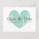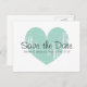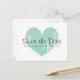 Turquoise blue heart save the date postcards for wedding. Vintage weathered love symbol with elegant script text for bride and groom names plus date. Cute romantic illustration design personalised with your message for guests. Customisable background colour ie white. Rustic country chic print for classy marriage party.