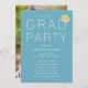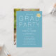 This modern graduation party invitation features an turquoise, white, and gold colour palette and a minimalist typography design. The phrase "Grad Party" is written in white modern typography against a light robin's egg blue background, and a gold graduation cap sits on the "D" in "Grad". Personalise the template on the front with your party details, then add a full photo of the graduate to the back of the invite.