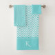 Stylish bath towel set done in turquoise blue and white, with polka dots and chevron patterns decorating the bath towel and the hand towel. The wash cloth is done in a solid turquoise. Personalise the white one letter monogram, on the bath towel to suit your needs.