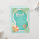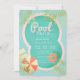 This "pool party" baby shower invitation card features a turquoise blue coloured pool with a salmon red inner tube, and a salmon red umbrella and beach chairs under the palm tree leaves on turquoise blue background. The reverse side features light turquoise blue watercolored stripe background. Change the background colour of both the front and the back, and personalise it for your needs. You can find more matching products at my store.