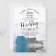 This beautiful wedding invitation features a photograph of a long-stemmed sky blue, turquoise, or azure coloured rose laying on its side reflecting in a pool of water with ripples and waves. The typography features an elegant script calligraphy and the wording is formal making this invitation both modern and classic. The back is a beautiful mottled light blue colour. Gorgeous way to invite your friends and family to share in your special day. This invite is optimised for the arch cut.