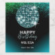 Retro birthday wine label featuring a shiny turquoise disco ball with green blue glitter on a black background.