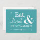 Invite friends and family to help you celebrate your recent marriage with this funky retro white on turquoise blue Eat, Drink & Be Married! elopement party invitation postcard.
