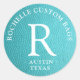 Turquoise faux leather background with serif font monogram and encircled information on the top in same font. Check our store for more items from this collection for a complete branding experience.