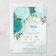 Beautiful birthday party invitation featuring turquoise and light blue flowers and green leaves