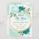 Beautiful save the date card featuring turquoise and light blue flowers and green leaves