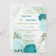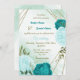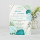Beautiful wedding invitation featuring turquoise and light blue flowers and green leaves