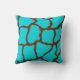 A bright turquoise and brown giraffe print decorates this throw pillow. The design is from original art.
