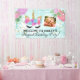 Add your daughter's custom photo to this pretty unicorn birthday party banner..."Welcome to (your girls' name) Magical Birthday party" banner sign decoration. Pretty pink, purple and turquoise blue flowers and pretty printed gold glitter unicorn horn and ears. Celebrate a unicorn themed birthday party for mystical magical fun and imagination with this whimsical unicorn themed decor.