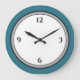 Modern clock features a minimalist design in a turquoise grey black and white colour palette. A simple plain design with black numbers on a white background with a turquoise blue border with grey accents.