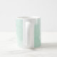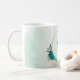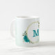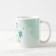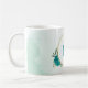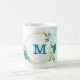 Beautiful coffee mug featuring turquoise and light blue flowers and green leaves