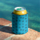 This can cooler has a mid-century modern design of scattered mazes on a field of turquoise.
