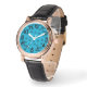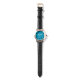 This women's watch has a mid-century modern design of scattered mazes on a field of turquoise.